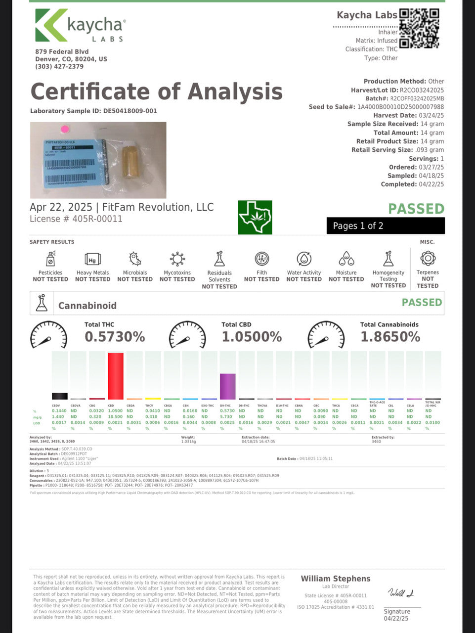 Verified by third-party laboratory testing (Kaycha Labs, COA dated 04/22/2025), this product contains a total D9-THC concentration of 0.573% by infused weight, with formulation controls limiting each spray's delivery to under 0.03% D9-THC by dry weight.