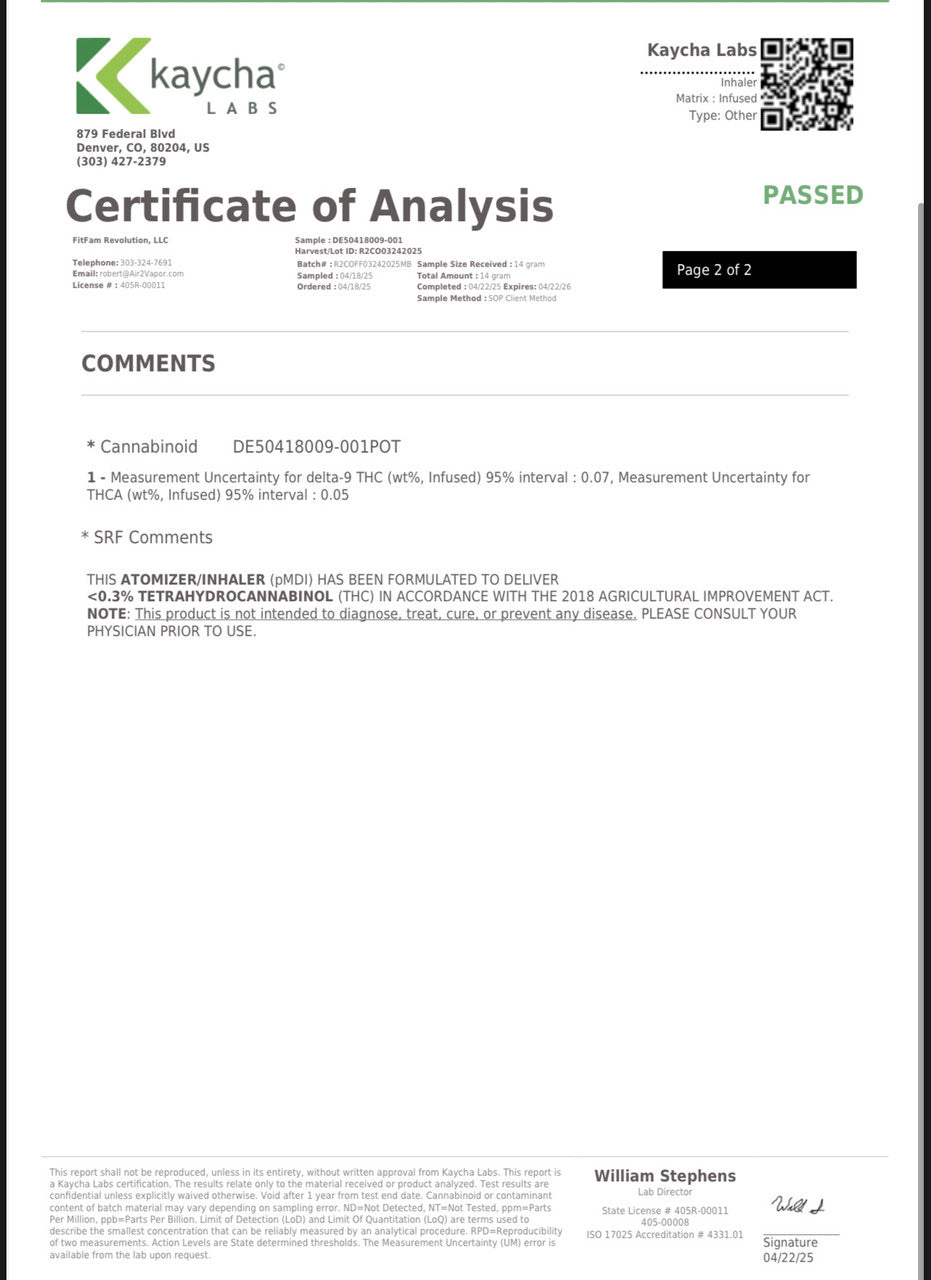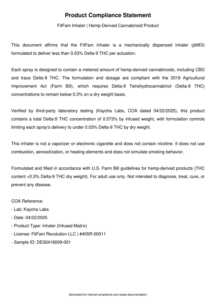 This product is a mechanically dispensed inhaler (pMDI) formulated to deliver less than 0.03% Delta-9 THC per actuation.